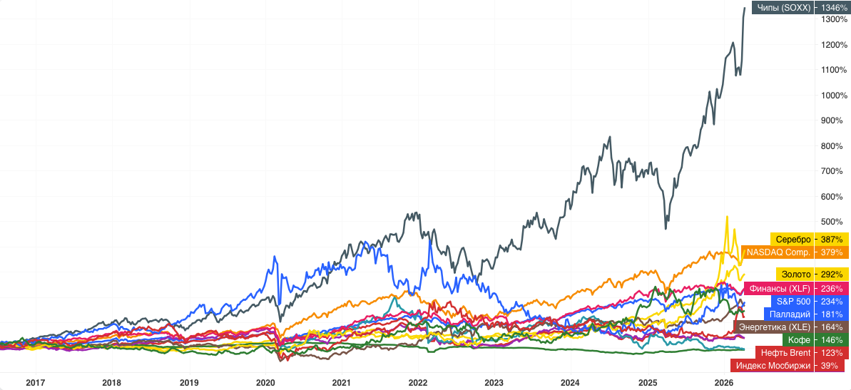 - Умный график отразит динамику роста всех выбранных активов и индексов.