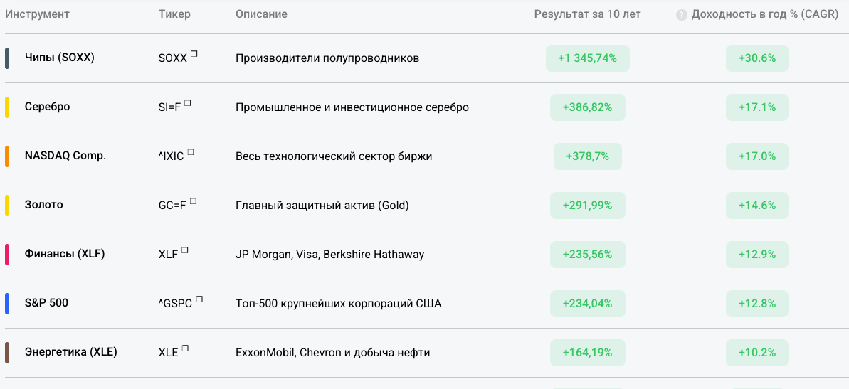 Активы, котрые дают больше 30% годовых на протяжении 10 лет.